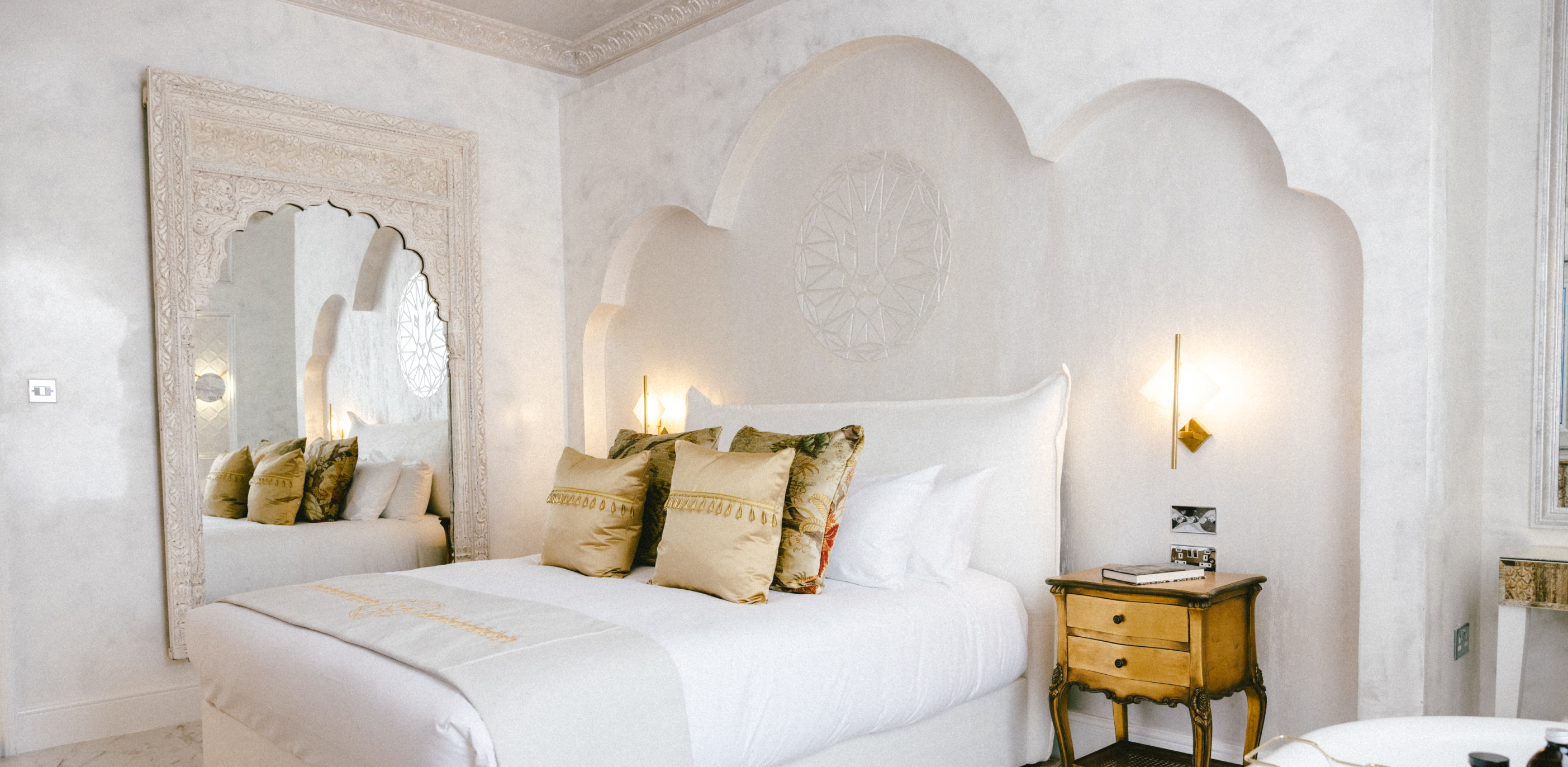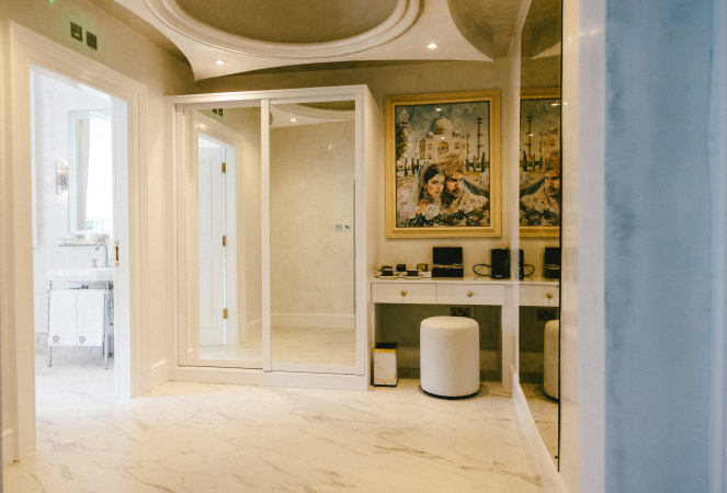 Immerse yourself in the splendour of the Taj Mahal Room at F8 MAISON Boutique Hotel, where the delicate artistry of one of the world’s most iconic monuments is reflected in every detail. The room’s decor, inspired by the intricate marble inlay and majestic carvings of the Taj Mahal, creates a serene and luxurious atmosphere. Opulent white tones complemented by subtle Mughal architectural accents invite you to a peaceful retreat.
